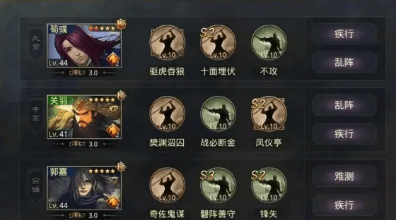 因为带了【战必断金】,所以面对菜刀队时比较有优势,但是【形兵之极】是加成中军输出,一般来说郭嘉和荀彧的位置应该互换,但是考虑到荀彧可能会被反击的原因,就只能无视掉【形兵之极】对中军的加成。
