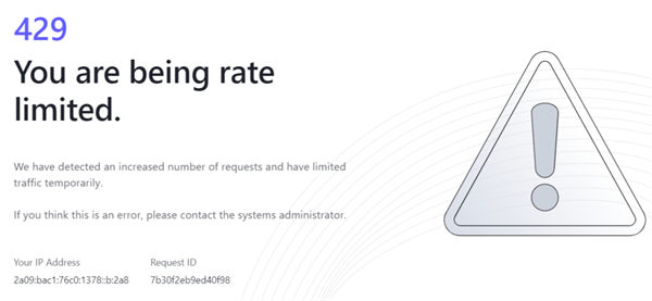 1. 提示"429 You are being rate limited"表示当前IP的请求频率太高,可以尝试换一个IP地址再使用。
