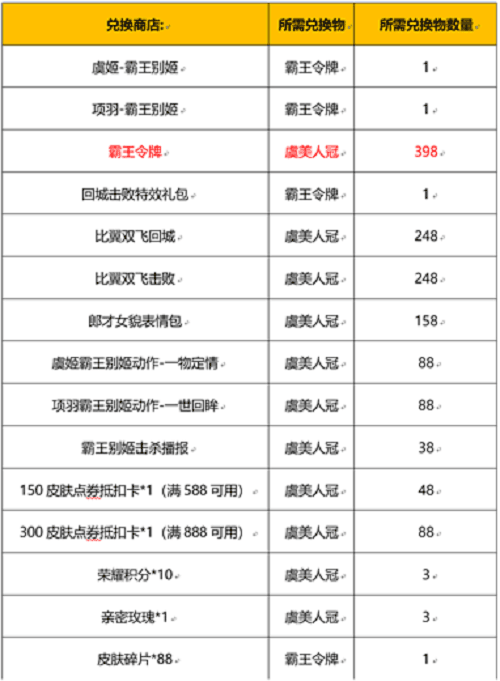 7、虞美人冠兑换:虞美人冠除了可以兑换霸王令牌,还可以在兑换商店兑换其他奖励,具体请见兑换商店;
