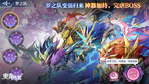 全新BOSS挑战玩法「龙神试炼」限时开启!龙族试炼包含初之试炼和进之试炼,参与试炼即可获得龙之币。龙之币可在商店中兑换梦之队、梦之队神器装备及梦之队觉醒魂等奖励。在活动期间,签到活跃即可任选梦之队神器装备!这个春节有了神器的加持,奥奇们一定能和梦之队一起完虐BOSS!此外,梦之队全新国潮皮肤「梨园萦梦·爱心梦梦」、「白鹤丹青·暗黑梦梦」、「黑白对弈·哆啦梦梦」、「醒狮舞火·热血梦梦」以及「百草神农·炼金梦梦」同步登场,集齐梦梦五个国潮皮肤即可拥有专属皮肤海报。