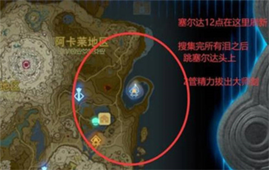 2:第十三个龙之泪在下图的位置,阿卡莱地区附近,我们回忆结束之后,十二点塞尔达会在天上,我们找到塞尔达头上,拔出大师剑即可;