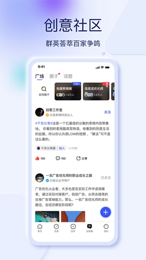 巨量创意app免费版下载是一款视频创意指导和创作工具,是一款非常专业的视频创造与广告为主的工具软件,这个软件中可以帮助视频创作者提高创作水平,优化视频质量,没有创作思路的用户可以来这里体验一下,巨量创意app免费版下载不仅可以开拓思路,还可以提升视频的特效质量 有着丰富的素材库,可以帮助大家设计出丰富的视频,并且还提供了多种创作工具,包括视频模板、特效、滤镜、背景音乐等,可以让用户更加便捷地进行视频制作和编辑。而且大家设计的作品广告还可以进行分类,帮助用户更好的寻找,不仅如此,这里还有广场圈子话题,让用户们可以在这里发布需求,沟通与交流,分享大家的经验,让需求更快的满足,大大的提高了效率,如果大家正在缺少这款视频创意指导软件,那么绝对你试一试。