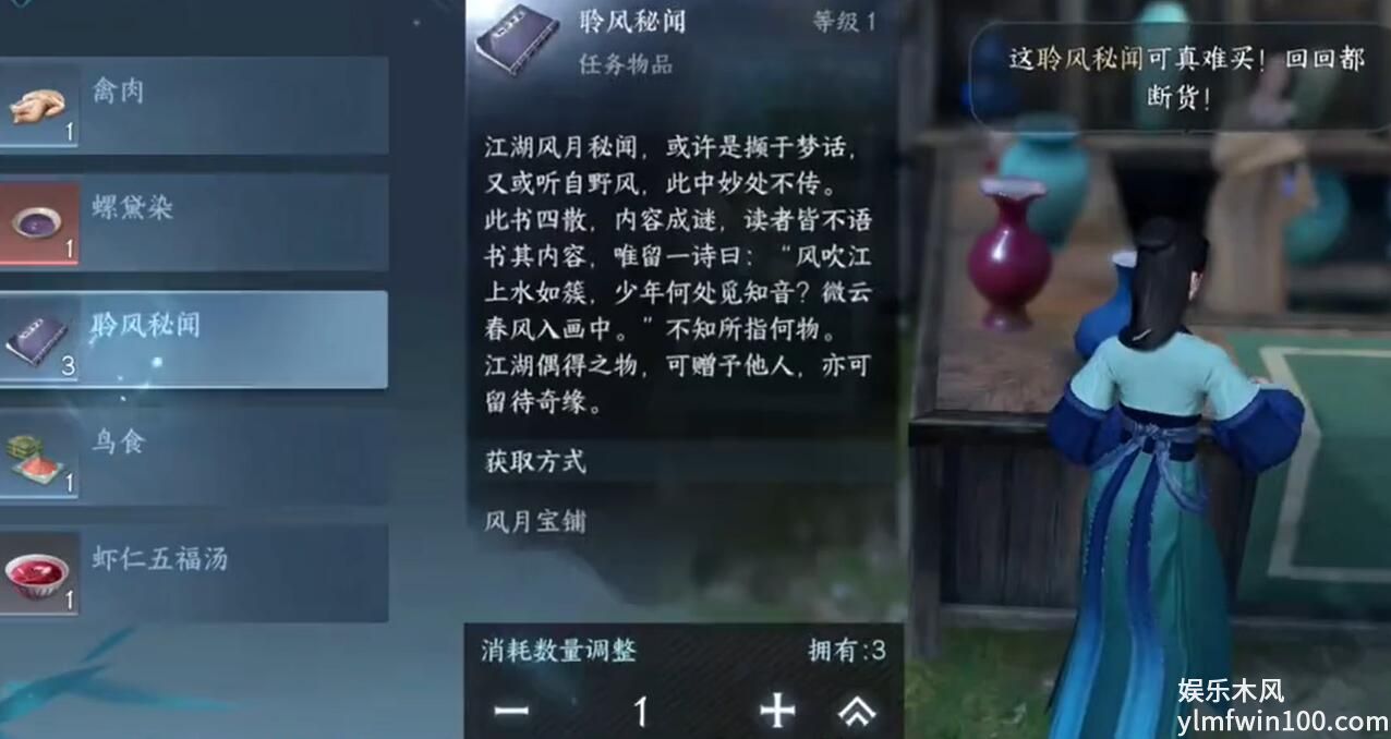 3、购买之后出示聆风秘闻给文葵即可完成任务风月小记。