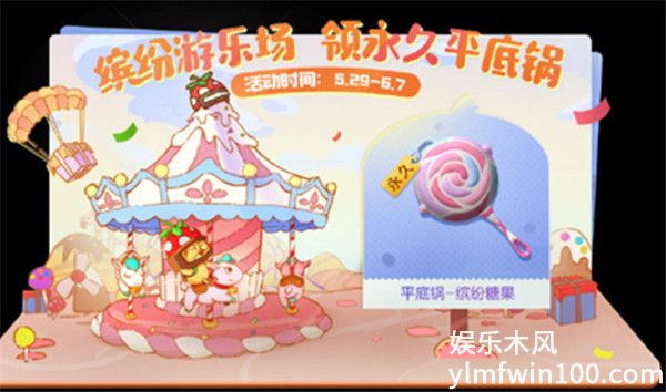 使用游乐券,让和平鸡上旋转木马达成指定次数,即可领取平底锅-缤纷糖果(永久)!