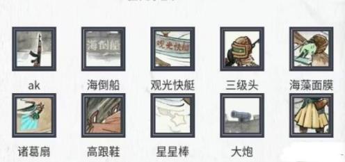 1、草船借舰-找出十处不合理的地方为:AK、海倒船、观光快艇、三级头、海藻面膜、诸葛扇、高跟鞋、星星棒、大炮、百褶裙
