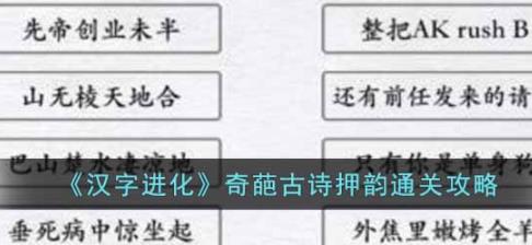 汉字进化奇葩古诗押韵怎么过?这个游戏是一个有关文字的一个益智休闲游戏,游戏中主要是由很多的文字以及各种古诗词等等还有一些网络热词构成各类关卡,有些关卡是需要玩家们把对应的古诗词以及文字连接起来的,还有很多的文字也是需要大家进行组合连接,合成押韵通顺的一个完整的句子,其中奇葩古诗押韵就是这类型的关卡,需要大家非常熟悉古诗的平仄押韵或者是对一些诗词熟悉,很多的玩家们可能不清楚这一关怎么过,下面小编就带来答案汉字进化奇葩古诗押韵攻略,快来看看吧。