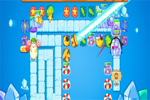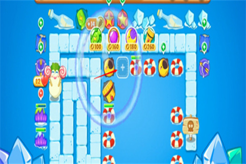5、修建月亮塔,在消除游泳圈之后在靠上的一排造两个月亮塔,来延缓怪物的行进速度,然后在利用边上的手电筒炮塔对怪物进行伤害。