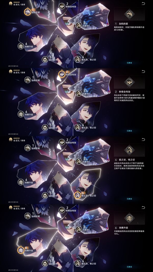 星魂方面,桑博的一星魂使战技的弹射伤害多加一段,也就是最多能挂五层【风化】;二星魂是处于【风化】状态的敌人被消灭后,大概率会给全体额外附加一层【风化】,大大提高桑博的叠层效率;四星魂则是战技命中处于五层【风化】的敌人时,会按照一定比例直接引爆敌人的【风化】效果,冷知识:黑天鹅挂的五层【奥迹】也可以被桑博战技引爆,同时【奥迹】和【风化】都可以一起叠层;六星魂则是【风化】的伤害倍率提高15%,也就是五层75%攻击力的提升,简单粗暴。