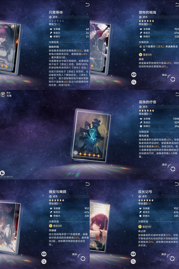 五星光锥,推荐卡芙卡的光锥【只需等待】,增伤、加速都是桑博所需要的,同时还附赠了额外的【游丝】效果,也就是【触电】的持续伤害。还有就是黑塔光锥【孤独的愈疗】,有持续伤害增伤和额外击杀回能,也加快了桑博终结技的循环。