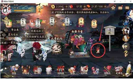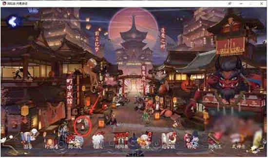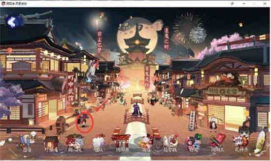 1、寻找源博雅小人,点击“町中”,老版的町中在右侧处,美食街和新版町中皮肤在左下角处。