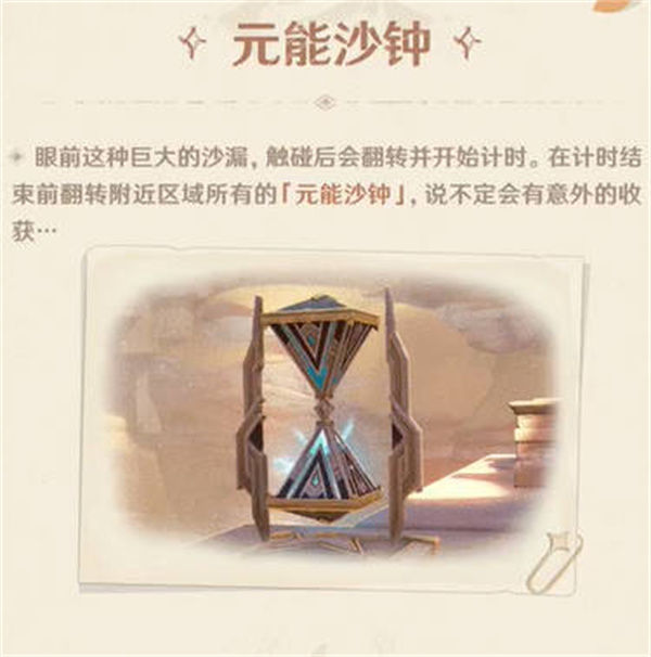 4:元能沙钟,这个是一个巨大的沙漏,触碰之后可以翻转进行倒计时,在计时结束之前附近区域所有的元能沙钟就有意外的收获;